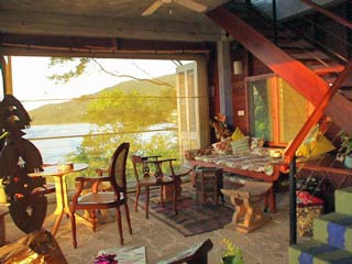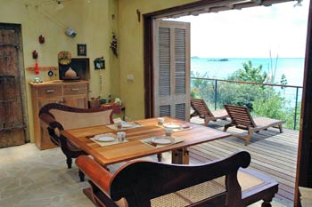 A spacious open living/ dining area, with local stone floor, opens onto ocean view verandas.